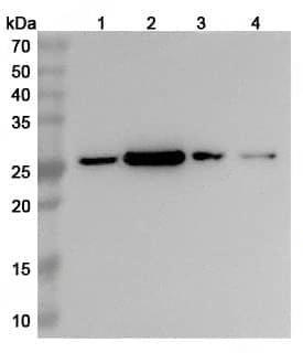 Western blot analysis was performed using anti-SRSF9 polyclonal antibody at 1ug/mL on various samples.Lane 1:HepG2 cell lysateLane 2:293T cell lysateLane 3:MOLT-4 cell lysateLane 4:Raji cell lysate