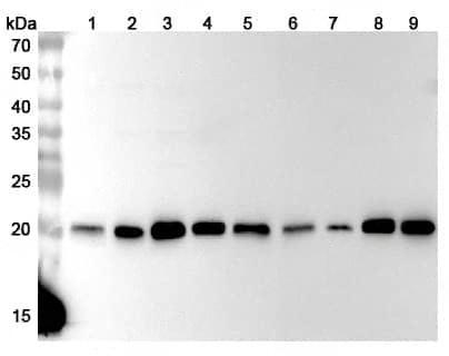 Western blot analysis was performed using anti-PSMB5 polyclonal antibody at 1μg/ml on various samples.Lane 1:NIH3T3 cell lysateLane 2:Hela cell lysateLane 3:HepG2 cell lysateLane 4:Jurkat cell lysateLane 5:LO2 cell lysateLane 6:U2OS cell lysateLane 7:K562 cell lysateLane 8:PC-3 cell lysateLane 9:MCF-7 cell lysate