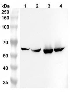 Western blot analysis was performed using anti-ALDH4A1 polyclonal antibody at 1μg/ml on various samples.Lane 1:Mouse liver lysateLane 2:Mouse kidney lysateLane 3:Rat liver lysateLane 4:Rat kidney lysate