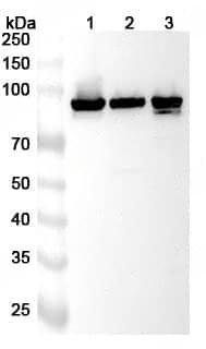 Western blot analysis was performed using anti-CANX polyclonal antibody at 1ug/mL on recombinant CANX (Catalog No.:TD-HB707012).,Western blot analysis was performed using anti-CALNEXIN polyclonal antibody at 1ug/mL on various samples.Lane 1:HepG2 cell lysateLane 2:K562 cell lysateLane 3:MCF-7 cell lysate