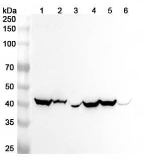 Western blot analysis was performed using anti-GOT1 polyclonal antibody at 1ug/mL on various samples.Lane 1:Mouse brain lysateLane 2:Mouse heart lysateLane 3:Mouse liver lysateLane 4:Rat brain lysateLane 5:Rat heart lysateLane 6:Rat liver lysate