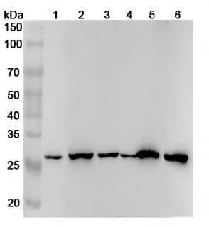 Western blot analysis was performed using anti-YWHAQ polyclonal antibody at 1ug/mL on various samples.Lane 1:NIH3T3 cell lysateLane 2:Jurkat cell lysateLane 3:A549 cell lysateLane 4:293T cell lysateLane 5:Mouse brain lysateLane 6:Rat brain lysate