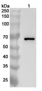 Western blot analysis was performed using anti-BRAF polyclonal antibody at 1ug/mL on various samples.Lane 1:K562 cell lysate
