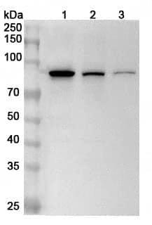 Western blot analysis was performed using anti-EIF4B polyclonal antibody at 1ug/mL on various samples.Lane 1:Hela cell lysateLane 2:K562 cell lysateLane 3:A549 cell lysate