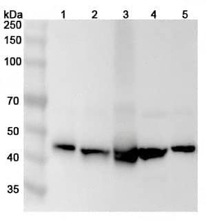 Western blot analysis was performed using anti-PAICS polyclonal antibody at 1μg/ml on various samples.Lane 1:HepG2 cell lysateLane 2:Hela cell lysateLane 3:Jurkat cell lysateLane 4:Raji cell lysateLane 5:K562 cell lysate