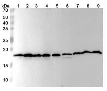 Western blot analysis was performed using anti-CFL1 polyclonal antibody at 1ug/mL on various samples.Lane 1:NIH3T3 cell lysateLane 2:MCF-7 cell lysateLane 3:H1299 cell lysateLane 4:Hela cell lysateLane 5:Jurkat cell lysateLane 6:SH-SY5Y cell lysateLane 7:PC-12 cell lysateLane 8:Mouse brain lysateLane 9:Rat brain lysate