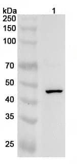 Western blot analysis was performed using anti-PAX1 polyclonal antibody at 1ug/mL on various samples.Lane 1:Raji cell lysate
