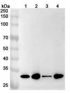 Western blot analysis was performed using anti-GTF2F2 polyclonal antibody at 1ug/mL on various samples.Lane 1:Hela cell lysateLane 2:K562 cell lysateLane 3:PC-3 cell lysateLane 4:293T cell lysate