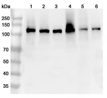 Western blot analysis was performed using anti-ITGA6 polyclonal antibody at 1ug/mL on various samples.Lane 1:Mouse spleen lysateLane 2:Mouse lung lysateLane 3:Mouse skin lysateLane 4:Rat kidney lysateLane 5:Rat lung lysateLane 6:Rat skin lysate