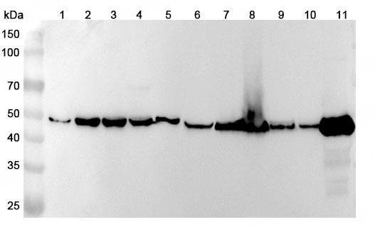 Western blot analysis was performed using anti-ENO3 polyclonal antibody at 1ug/mL on recombinant ENO3 (Catalog No.:TD-HB156012).,Western blot analysis was performed using anti-ENO3 polyclonal antibody at 1ug/mL on various samples.Lane 1:SH-SY5Y cell lysateLane 2:Hela cell lysateLane 3:HepG2 cell lysateLane 4:Jurkat cell lysateLane 5:A549 cell lysateLane 6:Mouse brain lysateLane 7:Mouse heart lysateLane 8:Mouse skeletal muscle lysateLane 9:Rat brain lysateLane 10:Rat heart lysateLane11:Rat skeletal muscle lysate