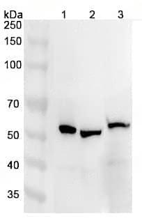 Western blot analysis was performed using anti-ATP6V1B1 polyclonal antibody at 1μg/ml on various samples.Lane 1:Mouse brain lysateLane 2:Mouse kidney lysateLane 3:Rat brain lysate