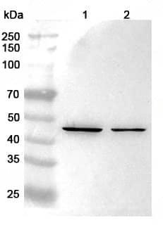 Western blot analysis was performed using anti-BGN polyclonal antibody at 1μg/ml on various samples.Lane 1:293T cell lysateLane 2:Hela cell lysate
