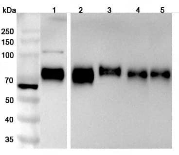 Western blot analysis was performed using anti-PVR polyclonal antibody at 1μg/ml on various samples.Lane 1:Hela cell lysateLane 2:A549 cell lysateLane 3:HUVEC cell lysateLane 4:LO2 cell lysate