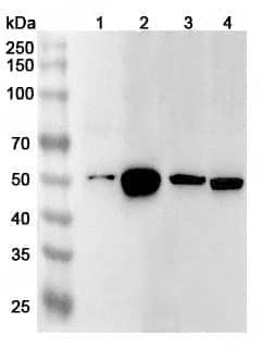 Western blot analysis was performed using anti-HNRNPH1 polyclonal antibody at 1ug/mL on various samples.Lane 1:Hela cell lysateLane 2:HepG2 cell lysateLane 3:A549 cell lysateLane 4:Mouse brain lysate