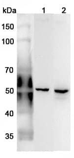 Western blot analysis was performed using anti-ANXA7 polyclonal antibody at 1μg/ml on various samples.Lane 1:Mouse brain lysateLane 2:Rat brain lysate