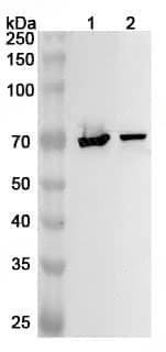 Western blot analysis was performed using anti-GRK4 polyclonal antibody at 1ug/mL on various samples.Lane 1:Mouse brain lysateLane 2:Rat brain lysate