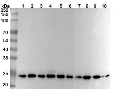Western blot analysis was performed using anti-PSMB1 polyclonal antibody at 1μg/ml on various samples.Lane 1:Hela cell lysateLane 2:HepG2 cell lysateLane 3:MCF-7 cell lysateLane 4:K562 cell lysateLane 5:THP-1 cell lysateLane 6:U937 cell lysateLane 7:Mouse spleen lysateLane 8:Mouse liver lysateLane 9:Rat spleen lysateLane 10:Rat liver lysate