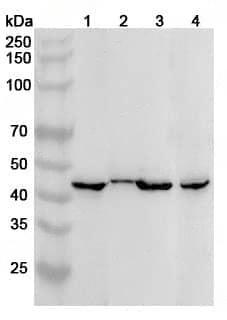 Western blot analysis was performed using anti-CD82 polyclonal antibody at 1ug/mL on various samples.Lane 1:Jurkat cell lysateLane 2:SW480 cell lysateLane 3:Mosue brain lysateLane 4:Rat brain lysate