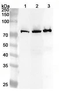 Western blot analysis was performed using anti-KLC2 polyclonal antibody at 1ug/mL on various samples.Lane 1:Raji cell lysateLane 2:Mouse testis lysateLane 3:Rat testis lysate