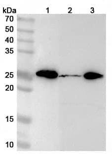 Western blot analysis was performed using anti-MRPL48 polyclonal antibody at 1ug/mL on various samples.Lane 1:Jurkat cell lysateLane 2:MCF-7 cell lysateLane 3:K562 cell lysate