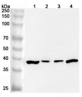 Western blot analysis was performed using anti-SAE1 polyclonal antibody at 1ug/mL on various samples.Lane 1:Jurkat cell lysateLane 2:MCF-7 cell lysateLane 3:NIH3T3 cell lysateLane 4:HT-29 cell lysate