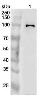 Western blot analysis was performed using anti-PACS2 polyclonal antibody at 1ug/mL on various samples.Lane 1:Mouse heart lysate
