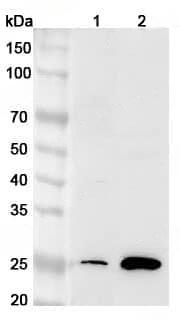 Western blot analysis was performed using anti-CDCA3 polyclonal antibody at 1ug/mL on various samples.Lane 1:C2C12 cell lysateLane 2:Mouse spleen lysate