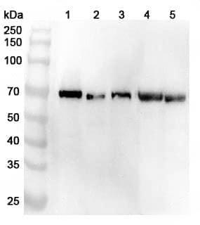 Western blot analysis was performed using anti-ALB polyclonal antibody at 1ug/mL on various samples.Lane 1:Hela cell lysateLane 2:LO2 cell lysateLane 3:NIH3T3 cell lysateLane 4:Rat kidney lysateLane 5:Rat spleen lysate