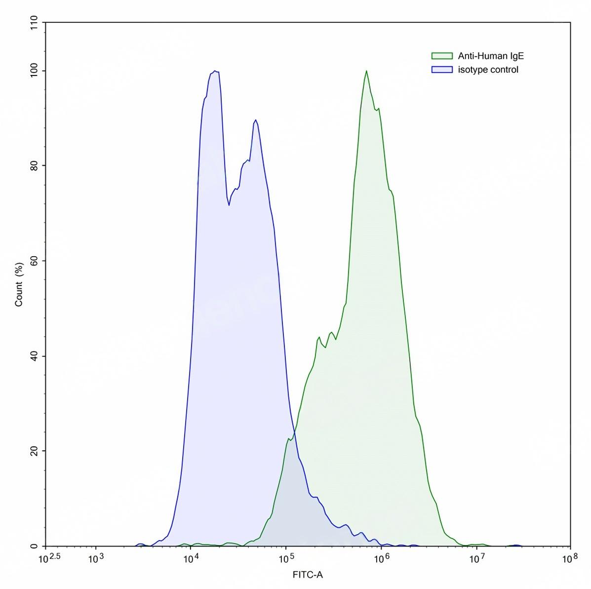 Flow-cytometry using anti-human IgE antibody.IgE Transfected CHO cells were stained with an irrelevant antibody (Blue Histogram) or an anti-human IgE antibody monoclonal antibody (Catalog # TD-HV064023 ,Green Histogram) at a concentration of 5 µg/ml for 30 mins at RT. After washing, bound antibody was detected using a FITC conjugated goat anti-mouse antibody (Catalog # TD-MF690414) and cells analysed on a NovoCyte Flow Cytometer.