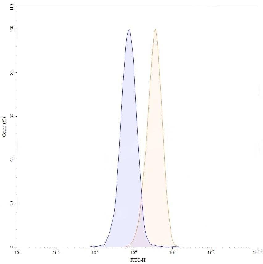 Flow-cytometry using FITC anti-human CD37 antibody. Raji cells were stained with an irrelevant antibody (Blue Histogram) or an FITC anti-human CD37 monoclonal antibody (Catalog: HY564036, Yellow Histogram) at a concentration of 5 µg/ml for 30 mins at RT. After washing, cells analysed on a NovoCyte Flow Cytometer.