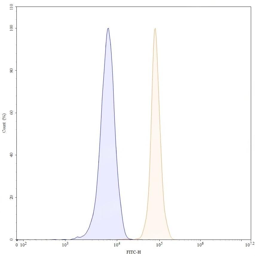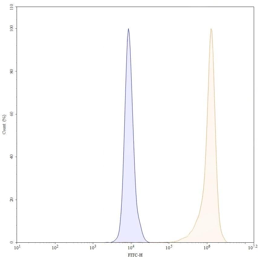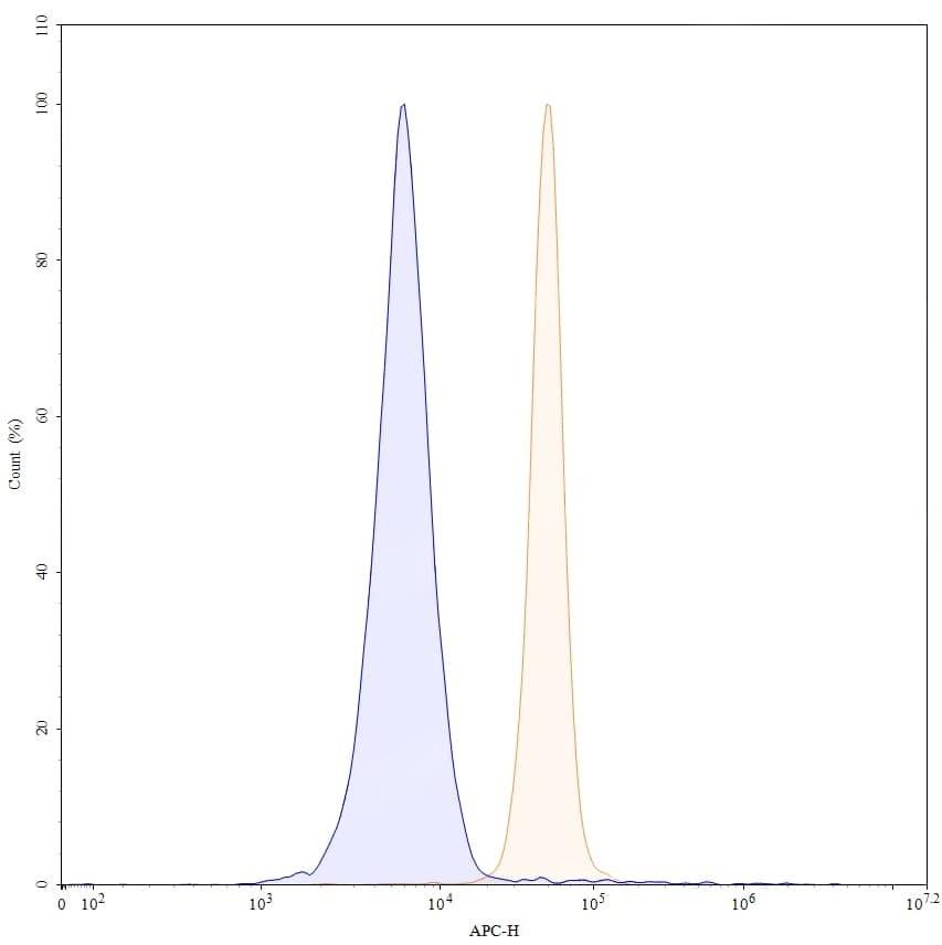 SEC-HPLC detection for Research Grade Gantenerumab. | SDS-PAGE for Research Grade Gantenerumab. | Flow-cytometry using anti-human APP antibody. SH-SY5Y cells were fixed and permeabilized, then stained with an irrelevant antibody (Blue Histogram) or an anti-human APP monoclonal antibody (Catalog HY235036, Yellow Histogram) at a concentration of 5 µg/ml for 30 mins at RT. After washing, bound antibody was detected using Goat Anti-Human IgG H&L Polyclonal Antibody, FITC (abinScience: HF690414) and cells analysed on a NovoCyte Flow Cytometer. | Flow-cytometry using APC anti-human APP antibody. SH-SY5Y cells were fixed and permeabilized, then stained with an irrelevant antibody (Blue Histogram) or an APC anti-human APP monoclonal antibody (Catalog HY235036, Yellow Histogram) at a concentration of 5 µg/ml for 30 mins at RT. After washing, cells analysed on a NovoCyte Flow Cytometer. ### Flow-cytometry using PE anti-human APP antibody. SH-SY5Y cells were fixed and permeabilized, then stained with an irrelevant antibody (Blue Histogram) or an PE anti-human APP monoclonal antibody (Catalog HY235036, Yellow Histogram) at a concentration of 5 µg/ml for 30 mins at RT. After washing, cells analysed on a NovoCyte Flow Cytometer. ### Flow-cytometry using FITC anti-human APP antibody. SH-SY5Y cells were fixed and permeabilized, then stained with an irrelevant antibody (Blue Histogram) or an FITC anti-human APP monoclonal antibody (Catalog HY235036, Yellow Histogram) at a concentration of 5 µg/ml for 30 mins at RT. After washing, cells analysed on a NovoCyte Flow Cytometer.