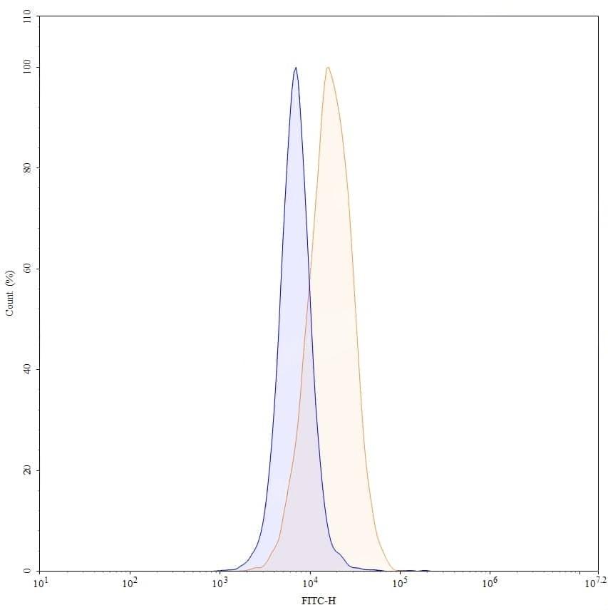 Flow-cytometry using APC anti-human CD117 antibody. HEL cells were stained with an irrelevant antibody (Blue Histogram) or an APC anti-human CD116 monoclonal antibody (Catalog: HY163026, Yellow Histogram) at a concentration of 5 µg/ml for 30 mins at RT. After washing, and cells analysed on a NovoCyte Flow Cytometer. ### Flow-cytometry using FITC anti-human CD117 antibody. HEL cells were stained with an irrelevant antibody (Blue Histogram) or an FITC anti-human CD116 monoclonal antibody (Catalog: HY163026, Yellow Histogram) at a concentration of 5 µg/ml for 30 mins at RT. After washing, and cells analysed on a NovoCyte Flow Cytometer. ### Flow-cytometry using PE anti-human CD117 antibody. HEL cells were stained with an irrelevant antibody (Blue Histogram) or an PE anti-human CD116 monoclonal antibody (Catalog: HY163026, Yellow Histogram) at a concentration of 5 µg/ml for 30 mins at RT. After washing, and cells analysed on a NovoCyte Flow Cytometer.