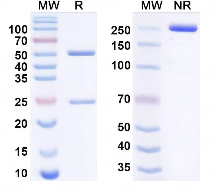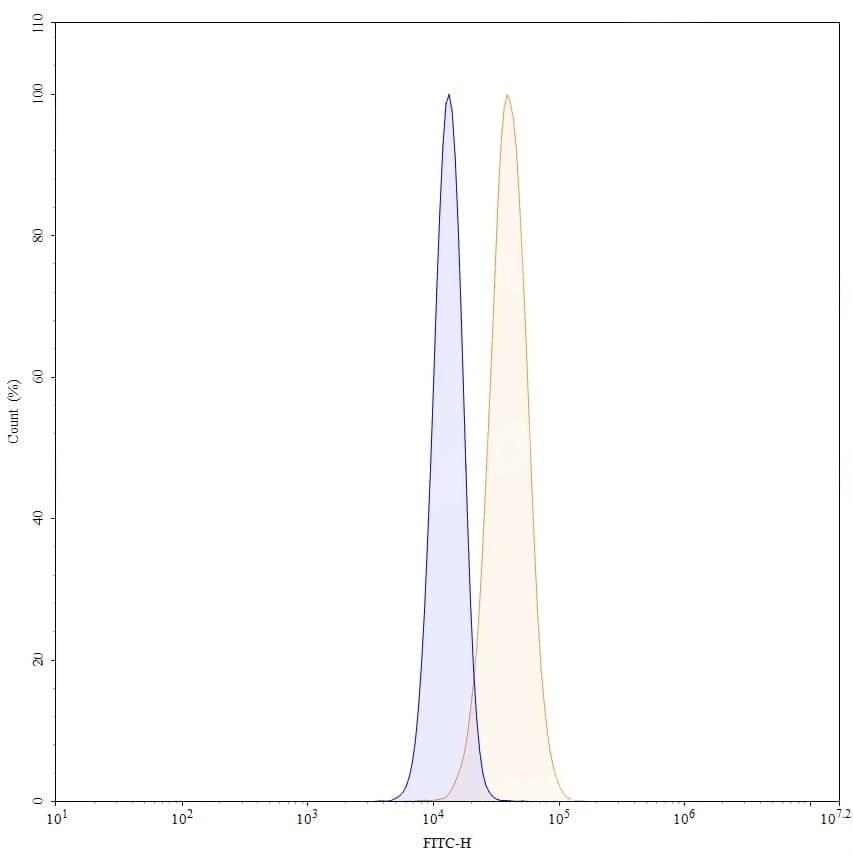 SEC-HPLC detection for Research Grade Batoclimab. | SDS-PAGE for Research Grade Batoclimab. | Flow-cytometry using FITC anti-human FCGRT antibody. HepG-2 cells were fixed and permeabilized, then stained with an irrelevant antibody (Blue Histogram) or an FITC anti-human FCGRT monoclonal antibody (Catalog: HX061036, Yellow Histogram) at a concentration of 5 µg/ml for 30 mins at RT. After washing, and cells analysed on a NovoCyte Flow Cytometer. ### Flow-cytometry using FITC anti-human FCGRT antibody. U937 cells were fixed and permeabilized, then stained with an irrelevant antibody (Blue Histogram) or an FITC anti-human FCGRT monoclonal antibody (Catalog: HX061036, Yellow Histogram) at a concentration of 5 µg/ml for 30 mins at RT. After washing, and cells analysed on a NovoCyte Flow Cytometer.