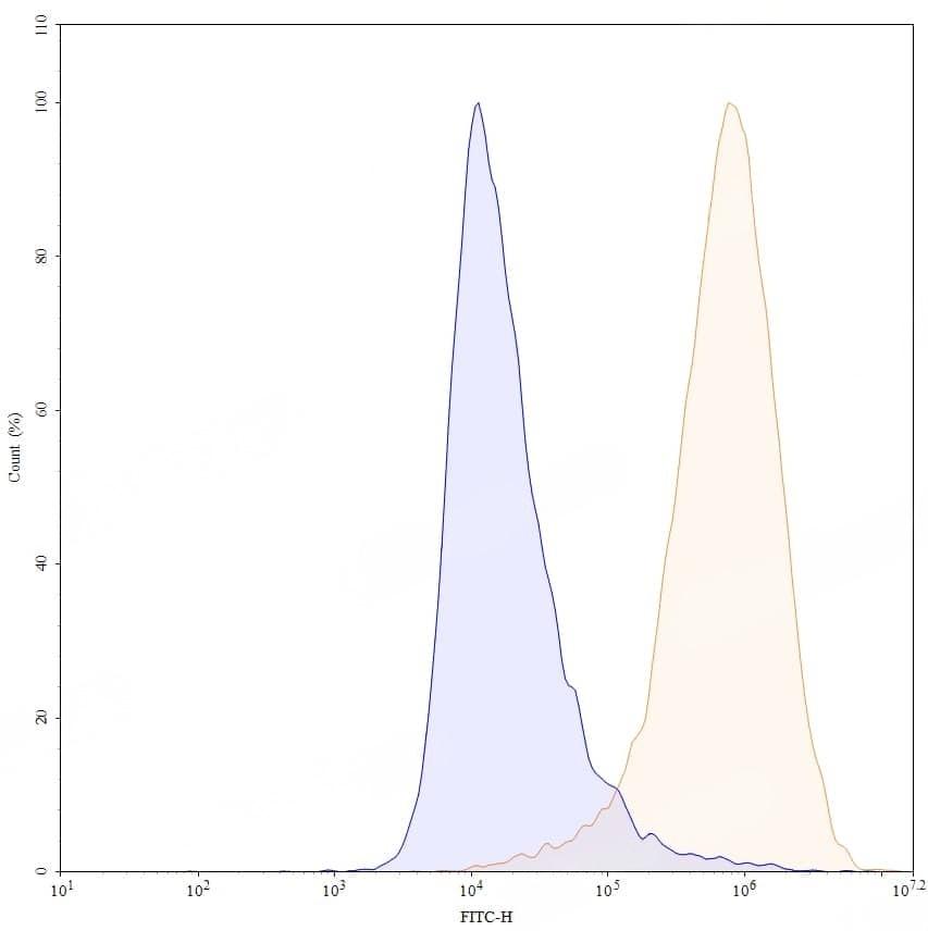 Detects CD274/PD-L1/B7-H1 in indirect ELISAs. | Flow-cytometry using APC anti-human CD274 antibody. MDA-MB-231 cells were stained with an irrelevant antibody (Blue Histogram) or an APC anti-human CD274 monoclonal antibody (Catalog: HV974086, Yellow Histogram) at a concentration of 5 µg/ml for 30 mins at RT. After washing, cells analysed on a NovoCyte Flow Cytometer. ### Flow-cytometry using FITC anti-human CD274 antibody. MDA-MB-231 cells were stained with an irrelevant antibody (Blue Histogram) or an FITC anti-human CD274 monoclonal antibody (Catalog: HV974086, Yellow Histogram) at a concentration of 5 µg/ml for 30 mins at RT. After washing, cells analysed on a NovoCyte Flow Cytometer. ### Flow-cytometry using PE anti-human CD274 antibody. MDA-MB-231 cells were stained with an irrelevant antibody (Blue Histogram) or an PE anti-human CD274 monoclonal antibody (Catalog: HV974086, Yellow Histogram) at a concentration of 5 µg/ml for 30 mins at RT. After washing, cells analysed on a NovoCyte Flow Cytometer. ### Flow-cytometry using anti-human CD274 antibody. Untransfected cells (blue Histogram) and Transfected cells (Yellow Histogram) were stained with an anti-human CD274 monoclonal antibody (Catalog: HV974086) at a concentration of 5 µg/ml for 30 mins at RT. After washing, bound antibody was detected using a Goat Anti-Human IgG H&L Polyclonal Antibody, FITC (abinScience: HF690414) and cells analysed on a NovoCyte Flow Cytometer.