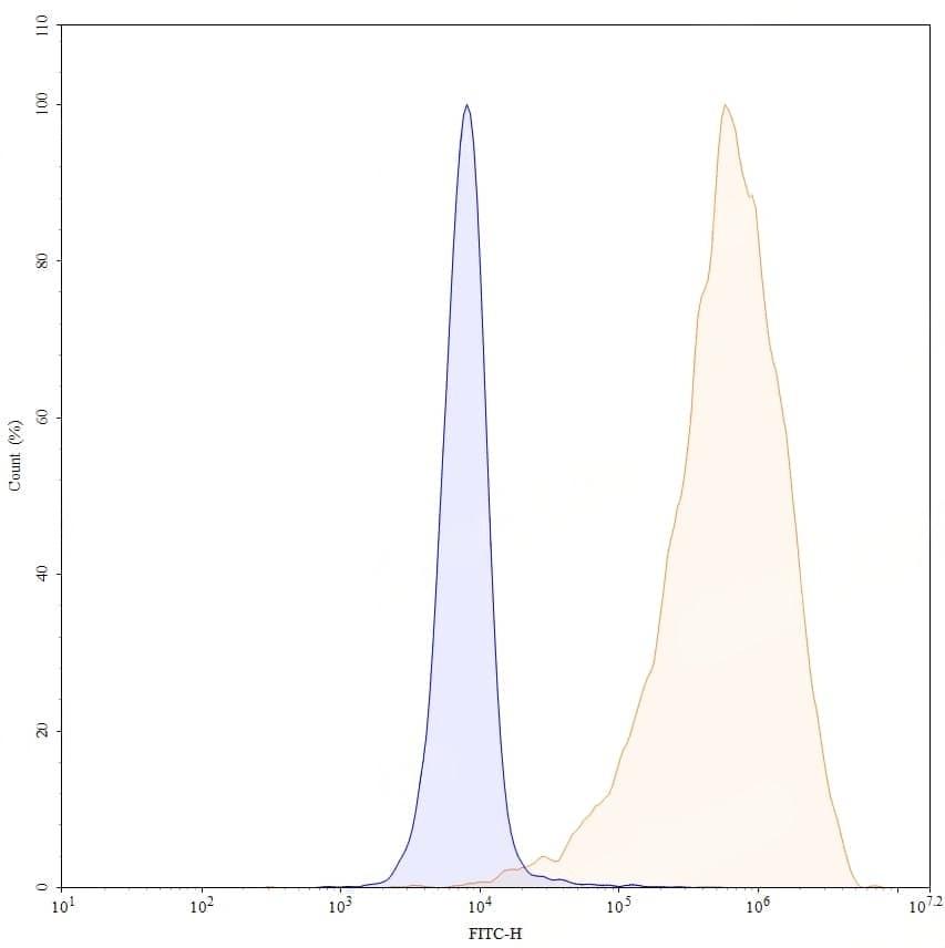 Detects Human CD274/PD-L1/B7-H1 in indirect ELISAs. | SDS-PAGE for Research Grade Envafolimab. | Flow-cytometry using APC anti-human CD274 antibody. MDA-MB-231 cells were stained with an irrelevant antibody (Blue Histogram) or an APC anti-human CD274 monoclonal antibody (Catalog: HV974046, Yellow Histogram) at a concentration of 5 µg/ml for 30 mins at RT. After washing, cells analysed on a NovoCyte Flow Cytometer. ### Flow-cytometry using FITC anti-human CD274 antibody. MDA-MB-231 cells were stained with an irrelevant antibody (Blue Histogram) or an FITC anti-human CD274 monoclonal antibody (Catalog: HV974046, Yellow Histogram) at a concentration of 5 µg/ml for 30 mins at RT. After washing, cells analysed on a NovoCyte Flow Cytometer. ### Flow-cytometry using PE anti-human CD274 antibody. MDA-MB-231 cells were stained with an irrelevant antibody (Blue Histogram) or an PE anti-human CD274 monoclonal antibody (Catalog: HV974046, Yellow Histogram) at a concentration of 5 µg/ml for 30 mins at RT. After washing, cells analysed on a NovoCyte Flow Cytometer. ### Flow-cytometry using anti-human CD274 antibody. Untransfected cells (blue Histogram) and Transfected cells (Yellow Histogram) were stained with an anti-human CD274 monoclonal antibody (Catalog: HV974046) at a concentration of 5 µg/ml for 30 mins at RT. After washing, bound antibody was detected using a Goat Anti-Human IgG H&L Polyclonal Antibody, FITC (abinScience: HF690414) and cells analysed on a NovoCyte Flow Cytometer.
