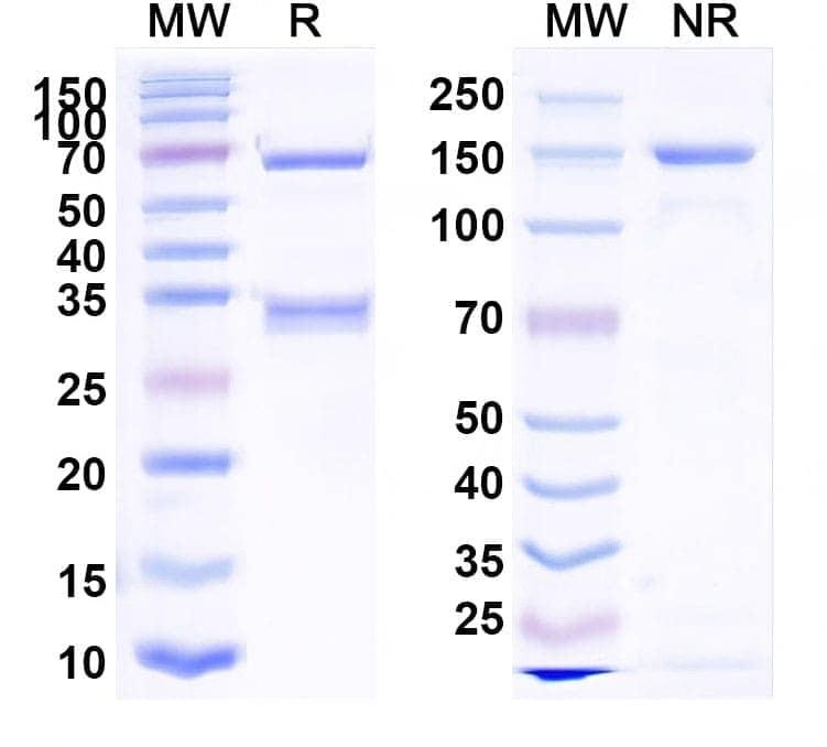 SDS-PAGE for Research Grade Obrindatamab | Detects CD276 in indirect ELISAs. ### Detects CD3E in indirect ELISAs. ### Detects CD276 in indirect ELISA. ### Detects Recombinant Human CD276 Protein, C-His (Cat No.:HV612011) in indirect ELISA. | Western blot analysis was performed using anti-CD276 monoclonal antibody at 1ug/mL on various samples.Lane 1:recombinant human CD276 (Catalog No:TD-HV612011)Lane 2:negative control