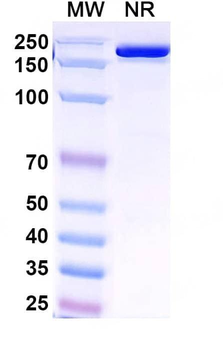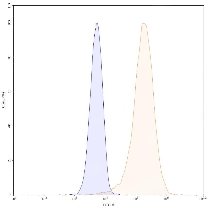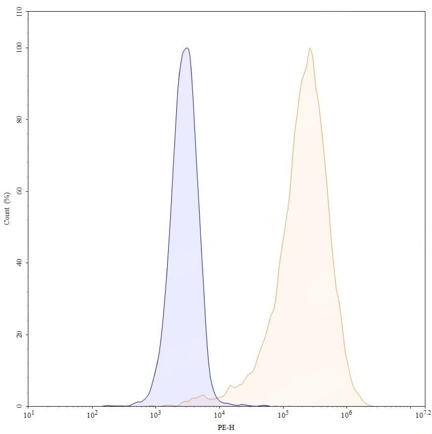 SDS-PAGE for Research Grade Venanprubart. | Flow-cytometry APC using anti-human CD272 antibody. Untransfected cells (blue Histogram) and Transfected cells (Yellow Histogram) were stained with an APC anti-human CD272 monoclonal antibody (Catalog HV375056) at a concentration of 5 µg/ml for 30 mins at RT. After washing, cells analysed on a NovoCyte Flow Cytometer. ### Flow-cytometry PE using anti-human CD272 antibody. Untransfected cells (blue Histogram) and Transfected cells (Yellow Histogram) were stained with an PE anti-human CD272 monoclonal antibody (Catalog HV375056) at a concentration of 5 µg/ml for 30 mins at RT. After washing, cells analysed on a NovoCyte Flow Cytometer. ### Flow-cytometry FITC using anti-human CD272 antibody. Untransfected cells (blue Histogram) and Transfected cells (Yellow Histogram) were stained with an FITC anti-human CD272 monoclonal antibody (Catalog HV375056) at a concentration of 5 µg/ml for 30 mins at RT. After washing, cells analysed on a NovoCyte Flow Cytometer.
