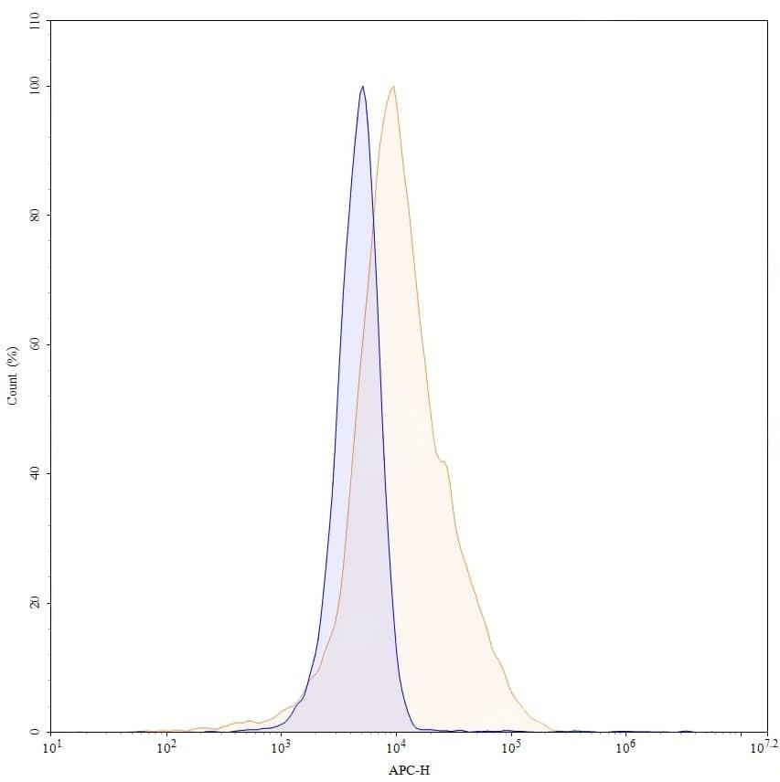 Western blot analysis was performed using anti-TSG101 monoclonal antibody at 1ug/mL on various samples.Lane 1:SH-SY5Y cell lysateLane 2:K562 cell lysateLane 3:NIH3T3 cell lysateLane 4:PC-12 cell lysateLane 5:Lncap cell lysateLane 6:293T cell lysateLane 7:Mouse brain lysateLane 8:Rat brain lysateLane 9:Rat heart lysate | Flow-cytometry using APC anti-human TSG101 antibody. Jurkat cells were fixed and permeabilized, then stained with an irrelevant antibody (Blue Histogram) or an APC anti-human TSG101 monoclonal antibody (Catalog No.:TD-HV181010, Yellow Histogram) at a concentration of 5 µg/ml for 30 mins at RT. After washing, cells analysed on a NovoCyte Flow Cytometer.,Flow-cytometry using PE anti-human TSG101 antibody. Jurkat cells were fixed and permeabilized, then stained with an irrelevant antibody (Blue Histogram) or an PE anti-human TSG101 monoclonal antibody (Catalog No.:TD-HV181010, Yellow Histogram) at a concentration of 5 µg/ml for 30 mins at RT. After washing, cells analysed on a NovoCyte Flow Cytometer.