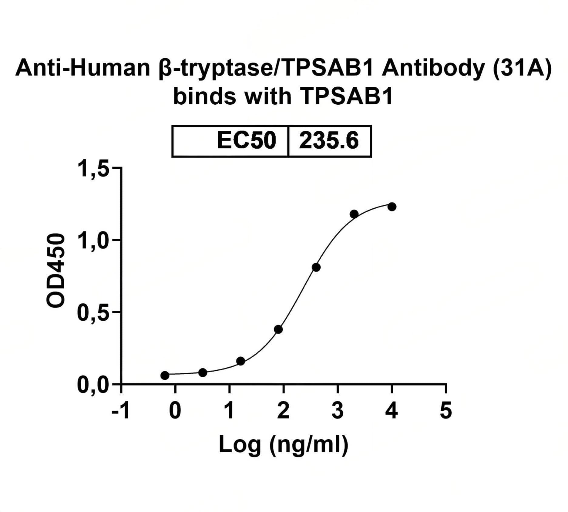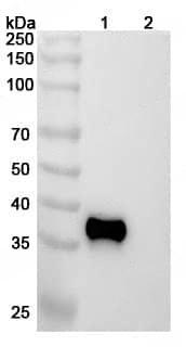 Detects Human β-tryptase/TPSAB1 in indirect ELISAs. | SDS-PAGE for InVivoMAb Anti-Human β-tryptase/TPSAB1 Antibody (31A). | Western blot analysis was performed using anti-TPSAB1/Tryptase-1 monoclonal antibody at 1ug/mL on various samples.Lane 1:recombinant human TPSAB1/Tryptase-1 (Catalog No.:TD-HS931011)Lane 2:negative control