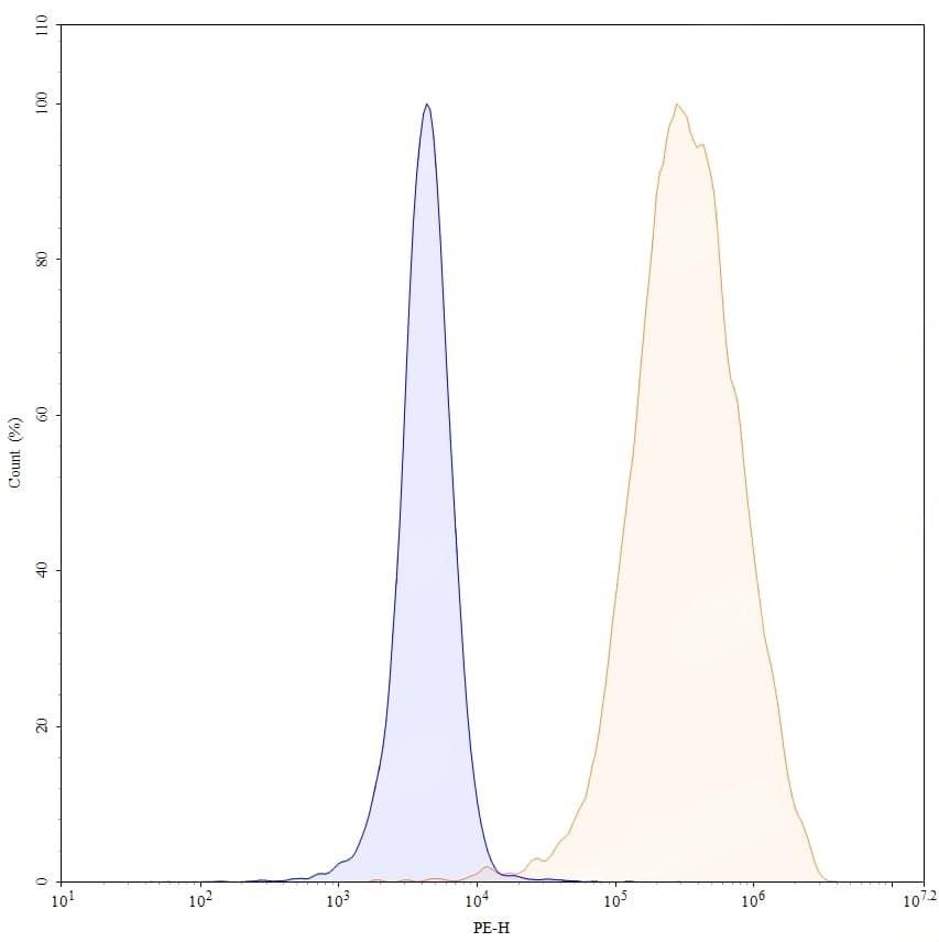Flow-cytometry using anti-human CD25 antibody. Untransfected cells (blue Histogram) and Transfected cells (Yellow Histogram) were stained with an anti-human CD25 monoclonal antibody (Catalog: HF996136) at a concentration of 5 µg/ml for 30 mins at RT. After washing, bound antibody was detected using a Goat Anti-Human IgG H&L Polyclonal Antibody, FITC (abinScience: HF690414) and cells analysed on a NovoCyte Flow Cytometer. | Flow-cytometry APC using anti-human CD25 antibody. Untransfected cells (blue Histogram) and Transfected cells (Yellow Histogram) were stained with an APC anti-human CD25 monoclonal antibody (Catalog HF996136) at a concentration of 5 µg/ml for 30 mins at RT. After washing, cells analysed on a NovoCyte Flow Cytometer. ### Flow-cytometry PE using anti-human CD25 antibody. Untransfected cells (blue Histogram) and Transfected cells (Yellow Histogram) were stained with an PE anti-human CD25 monoclonal antibody (Catalog HF996136) at a concentration of 5 µg/ml for 30 mins at RT. After washing, cells analysed on a NovoCyte Flow Cytometer.