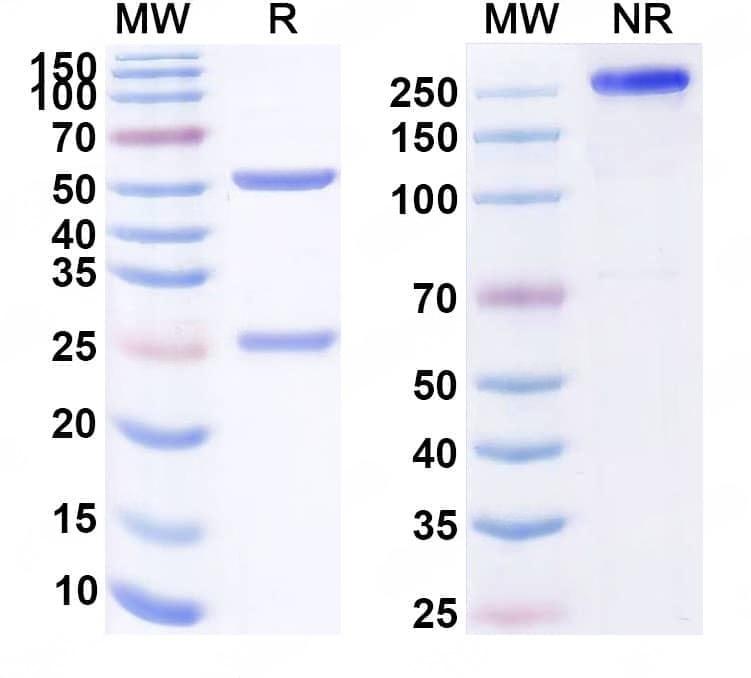 SEC-HPLC detection for Research Grade Adalimumab. | Detects Human TNFa/TNF-alpha in indirect ELISAs. | Flow-cytometry using anti-human TNFa antibody. 293T Transtected cells were stained with an irrelevant antibody (Blue Histogram) or an anti-human TNFa monoclonal antibody (Catalog HF879026, Yellow Histogram) at a concentration of 5 µg/ml for 30 mins at RT. After washing, bound antibody was detected using a a Goat Anti-Human IgG H&L Polyclonal Antibody, FITC (abinScience: HF690414) and cells analysed on a NovoCyte Flow Cytometer. | SDS-PAGE for Research Grade Adalimumab.