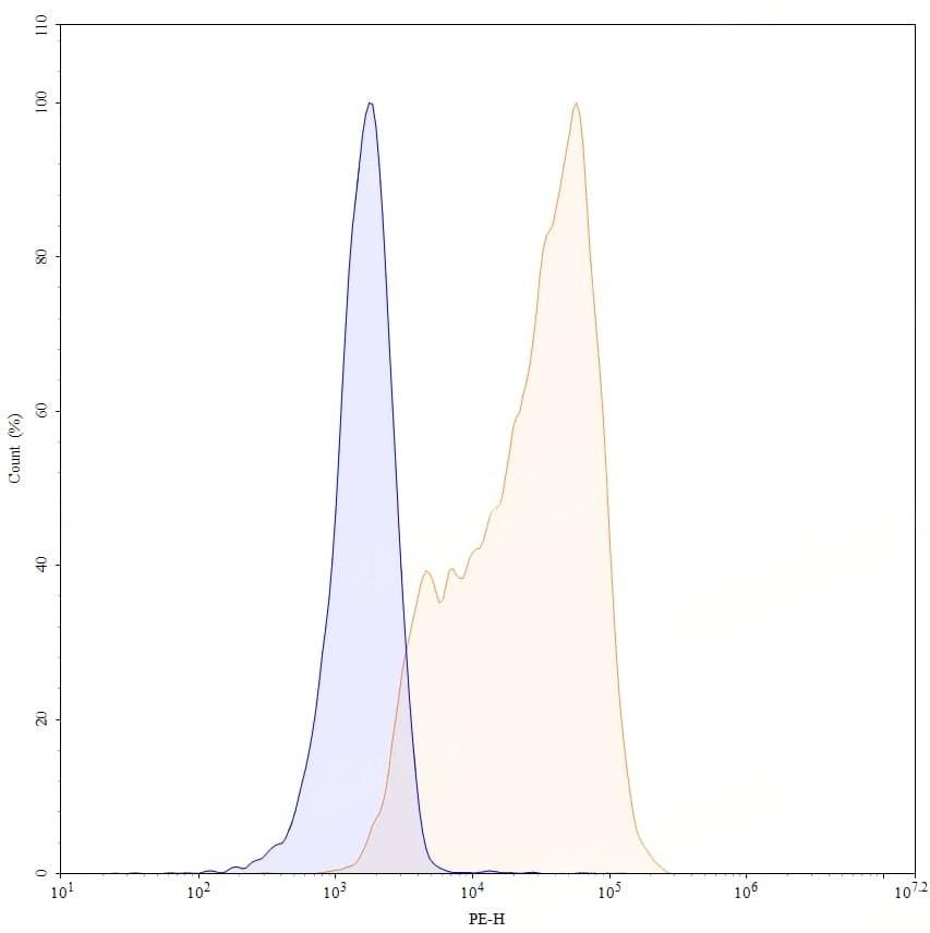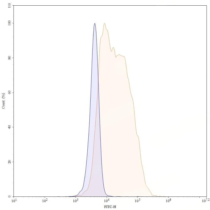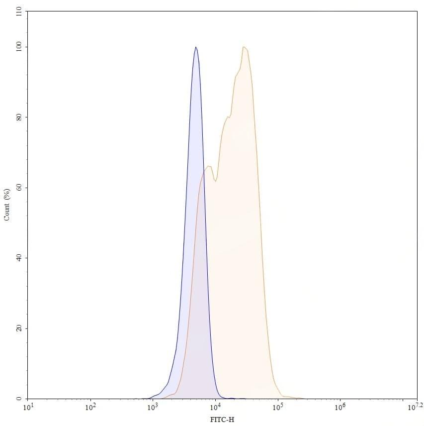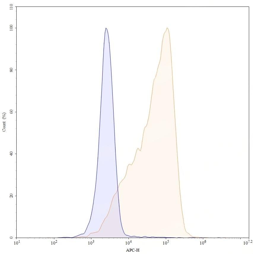 Detects Human TNFa/TNF-alpha in indirect ELISAs. | SDS-PAGE for Research Grade Certolizumab | Flow-cytometry using anti-human TNFa antibody. 293T transfected cells were stained with an irrelevant antibody (Blue Histogram) or an anti-human TNFa monoclonal antibody (Catalog HF879016, Yellow Histogram) at a concentration of 5 µg/ml for 30 mins at RT. After washing, bound antibody was detected using Goat Anti-Human IgG H&L Polyclonal Antibody, FITC (abinScience: HF690414) and cells analysed on a NovoCyte Flow Cytometer. | Flow-cytometry using APC anti-human TNFa antibody. 293T transfected cells were stained with an irrelevant antibody (Blue Histogram) or an APC anti-human TNFa monoclonal antibody (Catalog HF879016, Yellow Histogram) at a concentration of 5 µg/ml for 30 mins at RT. After washing, and cells analysed on a NovoCyte Flow Cytometer. ### Flow-cytometry using PE anti-human TNFa antibody. 293T transfected cells were stained with an irrelevant antibody (Blue Histogram) or an PE anti-human TNFa monoclonal antibody (Catalog HF879016, Yellow Histogram) at a concentration of 5 µg/ml for 30 mins at RT. After washing, and cells analysed on a NovoCyte Flow Cytometer. ### Flow-cytometry using FITC anti-human TNFa antibody. 293T transfected cells were stained with an irrelevant antibody (Blue Histogram) or an FITC anti-human TNFa monoclonal antibody (Catalog HF879016, Yellow Histogram) at a concentration of 5 µg/ml for 30 mins at RT. After washing, and cells analysed on a NovoCyte Flow Cytometer.
