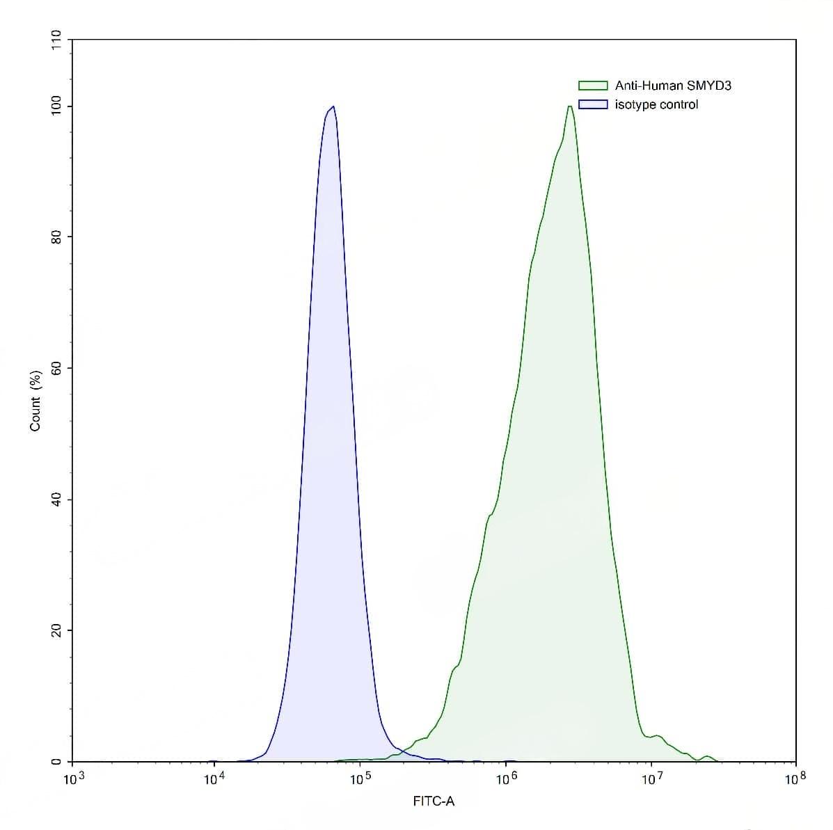 Flow-cytometry using anti-human SMYD3 antibody.HeLa cells were stained with an irrelevant antibody (Blue Histogram) or an anti-human SMYD3 antibody monoclonal antibody (Catalog No.:TD-HP320013 ,Green Histogram) at a concentration of 5 µg/ml for 30 mins at RT. After washing, bound antibody was detected using a FITC conjugated goat anti-mouse antibody (Catalog No.:TD-MF690414) and cells analysed on a NovoCyte Flow Cytometer. | SDS-PAGE for Anti-Human SMYD3 IP Antibody (SAA0230).