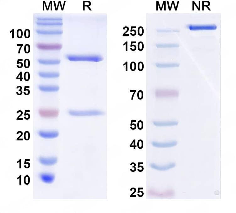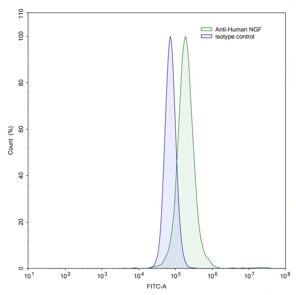 SEC-HPLC detection for InVivoMAb Anti-Human NGF/Beta-NGF (ABV0233). | Flow-cytometry using anti-human NGF antibody.NCI-H460 cells were stained with an irrelevant antibody (Blue Histogram) or an anti-human NGF antibody monoclonal antibody (Catalog No.:TD-HF909010 ,Green Histogram) at a concentration of 5 µg/ml for 30 mins at RT. After washing, bound antibody was detected using a FITC conjugated goat anti-human antibody (Catalog No.:TD-HF690414) and cells analysed on a NovoCyte Flow Cytometer. | SDS-PAGE for InVivoMAb Anti-Human NGF/Beta-NGF (Iv0066). | Western blot analysis was performed using anti-NGF monoclonal antibody at 1ug/mL on various samples.Lane 1:recombinant human NGF (Catalog No.:TD-HF909011)Lane 2:negative control