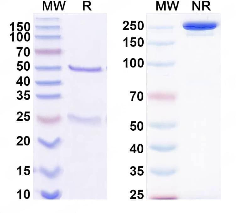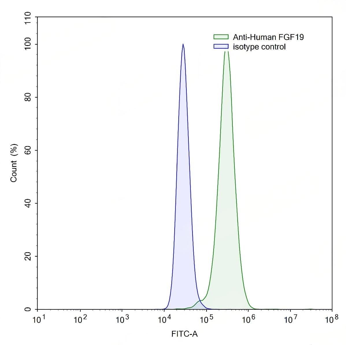 SEC-HPLC detection for Anti-Human FGF19 Antibody (ABS0484). | Flow-cytometry using anti-human FGF19 antibody.HT-29 cells were stained with an irrelevant antibody (Blue Histogram) or an anti-human FGF19 antibody monoclonal antibody (Catalog No.:TD-HF862013 ,Green Histogram) at a concentration of 5 µg/ml for 30 mins at RT. After washing, bound antibody was detected using a FITC conjugated goat anti-human antibody (Catalog No.:TD-HF690414) and cells analysed on a NovoCyte Flow Cytometer. | SDS-PAGE for Anti-Human FGF19 Antibody (SAA1435). | Western blot analysis was performed using anti-human FGF19 monoclonal antibody at 1ug/mL on various samples.Lane 1:recombinant human FGF19 (Catalog No.:TD-HF862012)Lane 2:negative control