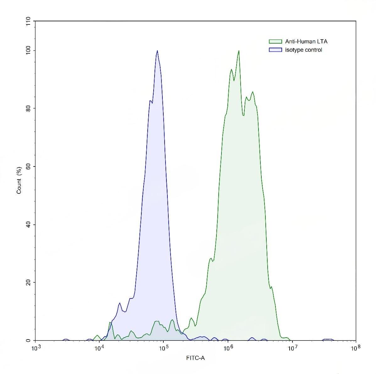 Flow-cytometry using anti-human LTA antibody.LTA/TNF-beta Transfected SF9 cells were stained with an irrelevant antibody (Blue Histogram) or an anti-human LTA antibody monoclonal antibody (Catalog No.:TD-HF686010 ,Green Histogram) at a concentration of 5 µg/ml for 30 mins at RT. After washing, bound antibody was detected using a FITC conjugated goat anti-human antibody (Catalog No.:TD-HF690414) and cells analysed on a NovoCyte Flow Cytometer. | SDS-PAGE for InVivoMAb Anti-Human LTA/TNF-beta (Iv0051).