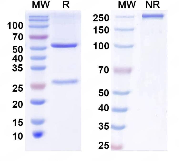SEC-HPLC detection for InVivoMAb Anti-Human IFNA1/Interferon alpha-D (ABV0160). | Flow-cytometry using anti-human IFNA1 antibody.SHSY-5Y cells were stained with an irrelevant antibody (Blue Histogram) or an anti-human IFNA1 antibody monoclonal antibody (Catalog No.:TD-HF565010 ,Green Histogram) at a concentration of 5 µg/ml for 30 mins at RT. After washing, bound antibody was detected using a FITC conjugated goat anti-human antibody (Catalog No.:TD-HF690414) and cells analysed on a NovoCyte Flow Cytometer. | SDS-PAGE for InVivoMAb Anti-Human IFNA1/Interferon alpha-D (Iv0036).