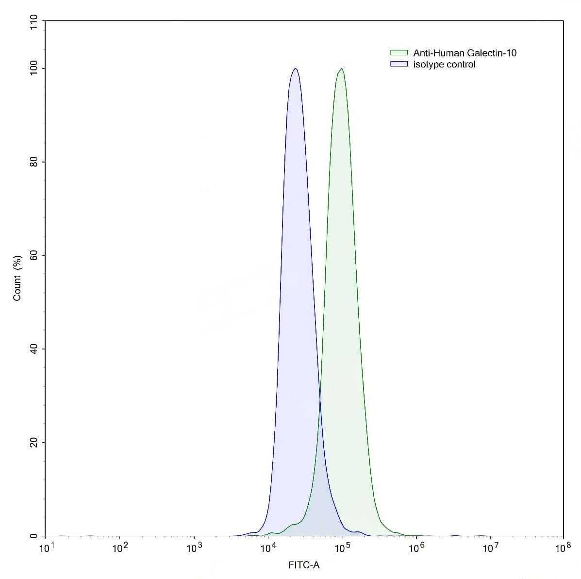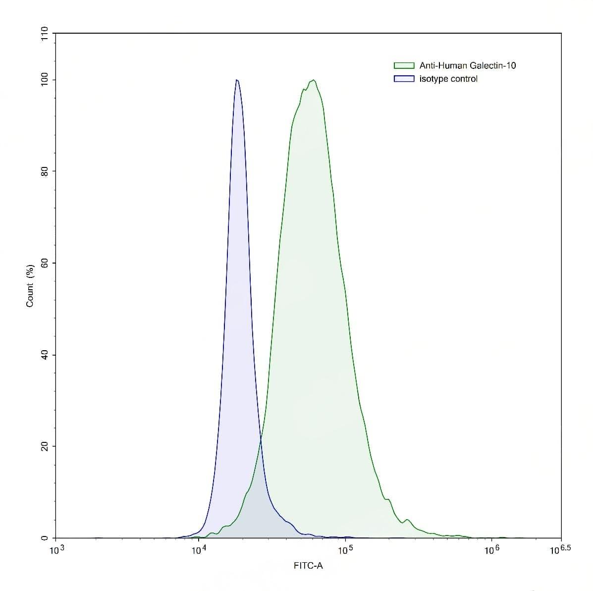 Detects Human GAL10/CLC/Galectin-10 in indirect ELISAs. | Flow-cytometry using anti-human Galectin-10 antibody.HL-60 cells were stained with an irrelevant antibody (Blue Histogram) or an anti-human Galectin-10 antibody monoclonal antibody (Catalog No.:TD-HC313013 ,Green Histogram) at a concentration of 5 µg/ml for 30 mins at RT. After washing, bound antibody was detected using a FITC conjugated goat anti-mouse antibody (Catalog No.:TD-MF690414) and cells analysed on a NovoCyte Flow Cytometer.,Flow-cytometry using anti-human Galectin-10 antibody.HeLa cells were stained with an irrelevant antibody (Blue Histogram) or an anti-human Galectin-10 antibody monoclonal antibody (Catalog No.:TD-HC313013 ,Green Histogram) at a concentration of 5 µg/ml for 30 mins at RT. After washing, bound antibody was detected using a FITC conjugated goat anti-mouse antibody (Catalog No.:TD-MF690414) and cells analysed on a NovoCyte Flow Cytometer.,Flow-cytometry using anti-human Galectin-10 antibody.Human peripheral blood lymphocytes were stained with an irrelevant antibody (Blue Histogram) or an anti-human Galectin-10 antibody monoclonal antibody (Catalog No.:TD-HC313013 ,Green Histogram) at a concentration of 5 µg/ml for 30 mins at RT. After washing, bound antibody was detected using a FITC conjugated goat anti-mouse antibody (Catalog No.:TD-MF690414) and cells analysed on a NovoCyte Flow Cytometer. | SDS-PAGE for Anti-Human Gal-10/CLC Antibody (1D11).