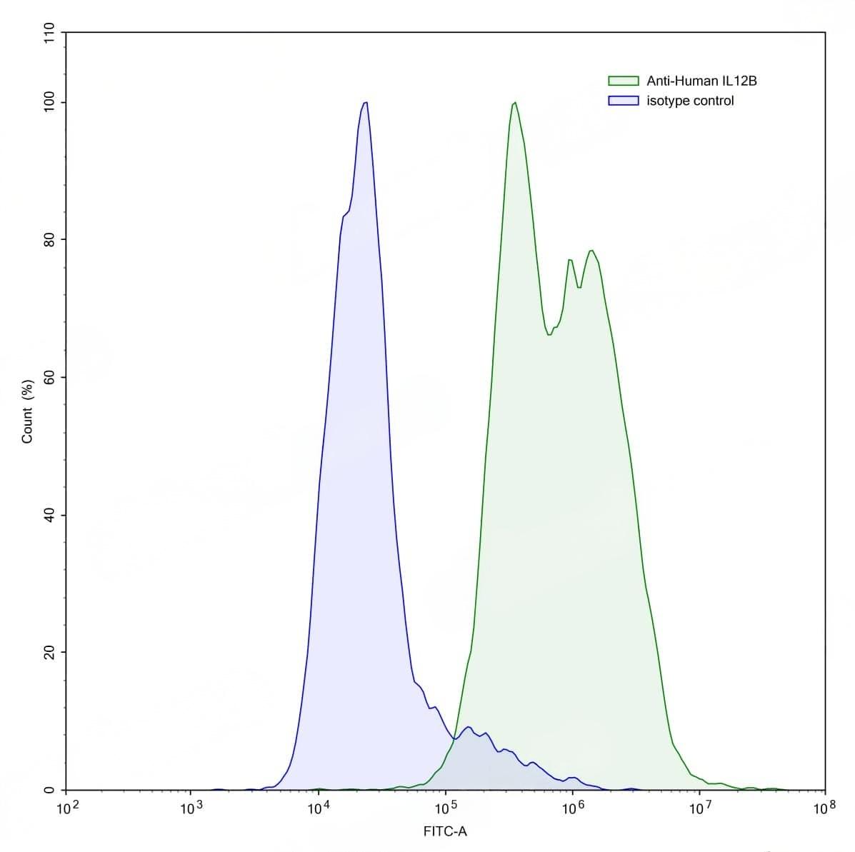 Flow-cytometry using anti-human IL12B antibody.IL12B Transfected CHO cells were stained with an irrelevant antibody (Blue Histogram) or an anti-human IL12B antibody monoclonal antibody (Catalog No.:TD-HB769010 ,Green Histogram) at a concentration of 5 µg/ml for 30 mins at RT. After washing, bound antibody was detected using a FITC conjugated goat anti-human antibody (Catalog No.:TD-HF690414) and cells analysed on a NovoCyte Flow Cytometer. | SDS-PAGE for InVivoMAb Anti-Human IL12B/IL-12 p40/NKSF2 (Iv0026).