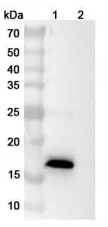 SDS-PAGE for Anti-Human AREG Antibody (SAA1585) | Detects recombinant human AREG (Catalog No.:TD-HB092012) in indirect ELISA | Western blot analysis was performed using anti-AREG monoclonal antibody at 1ug/mL on various samples.Lane 1:recombinant human AREG (Catalog No.:TD-HB092012)Lane 2:negative control